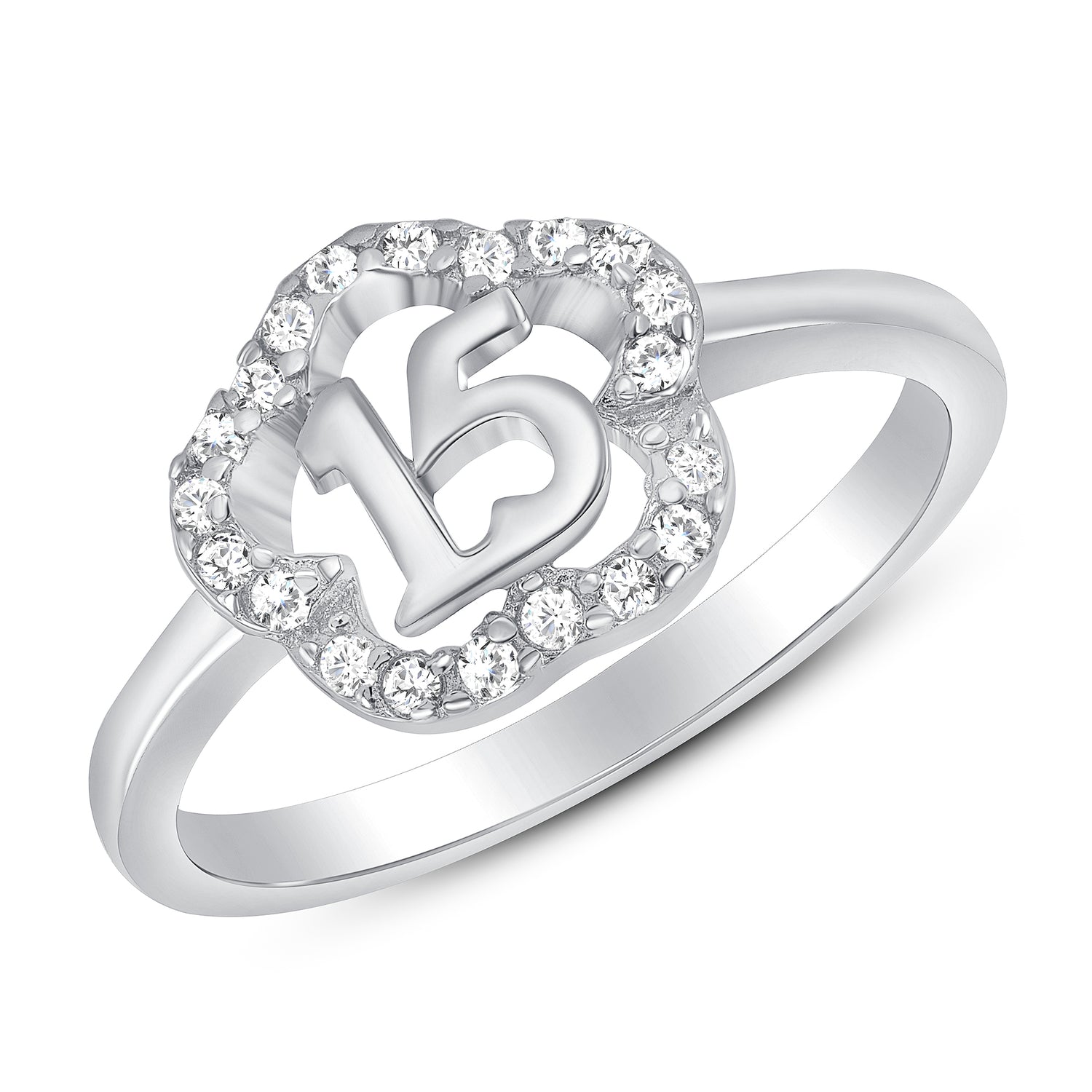 Silver 925 Rhodium Plated Cubic Zirconia Flower Outline 15 Years Ring. GR1153